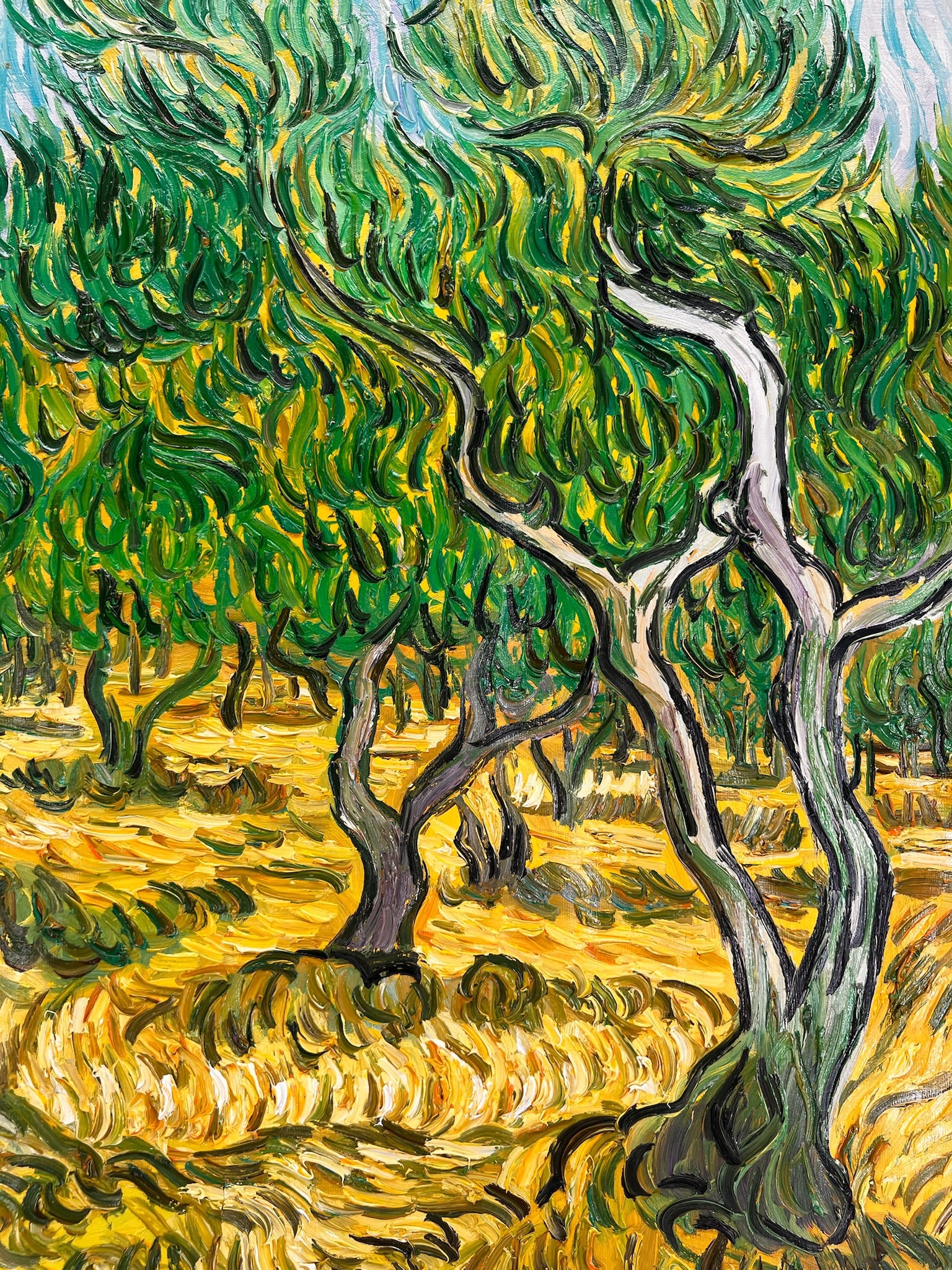 Dit kunstwerk straalt beweging uit, met dynamische wervelingen in de lucht en expressieve lijnen in de knoestige olijfbomen en het gouden veld. De handgeschilderde replica behoudt de kracht en textuur van Van Gogh’s penseelstreken en vormt zo een prachtig en levendig middelpunt voor elke ruimte.