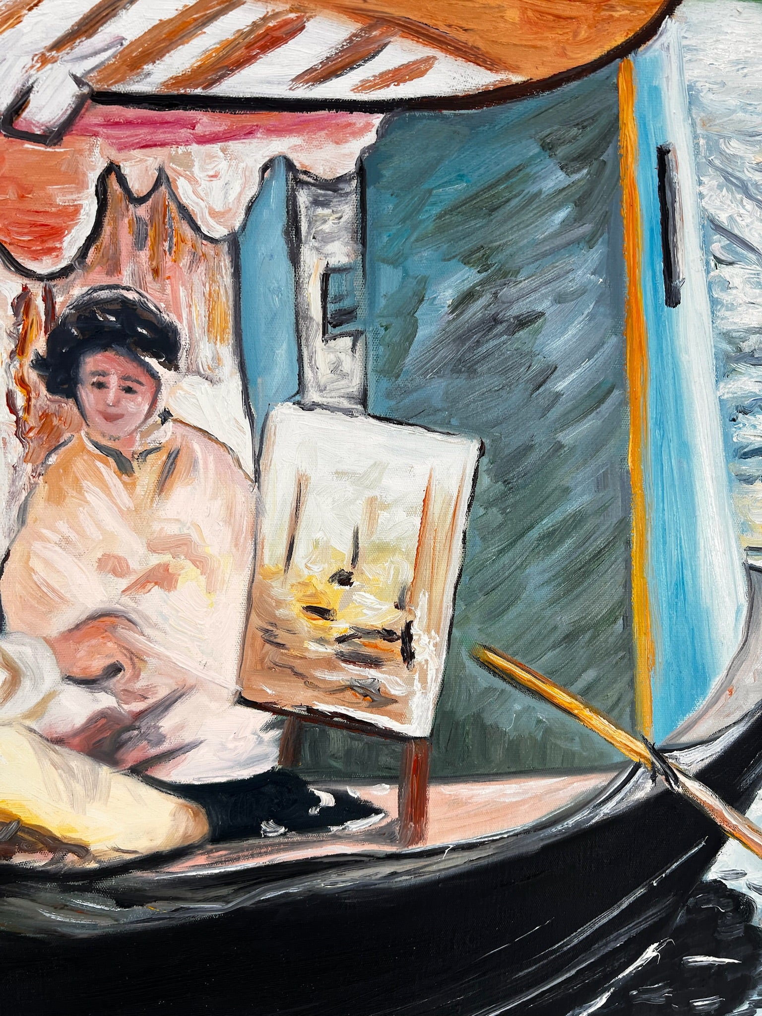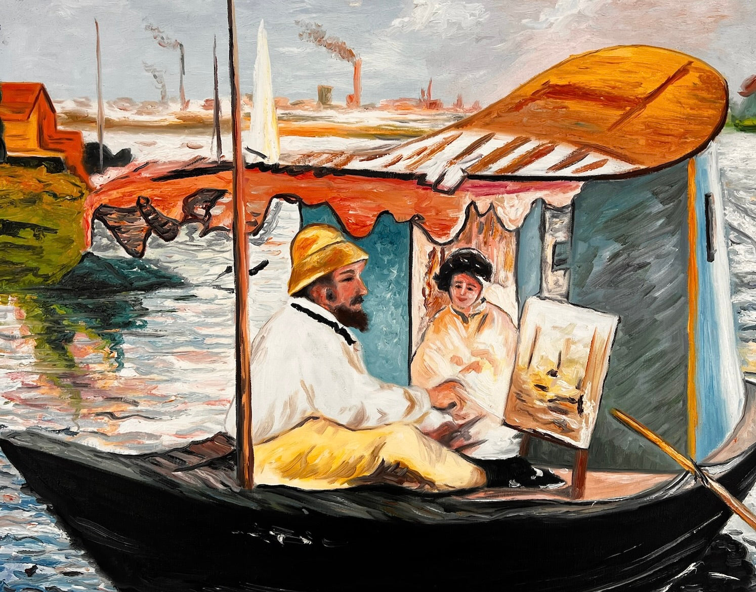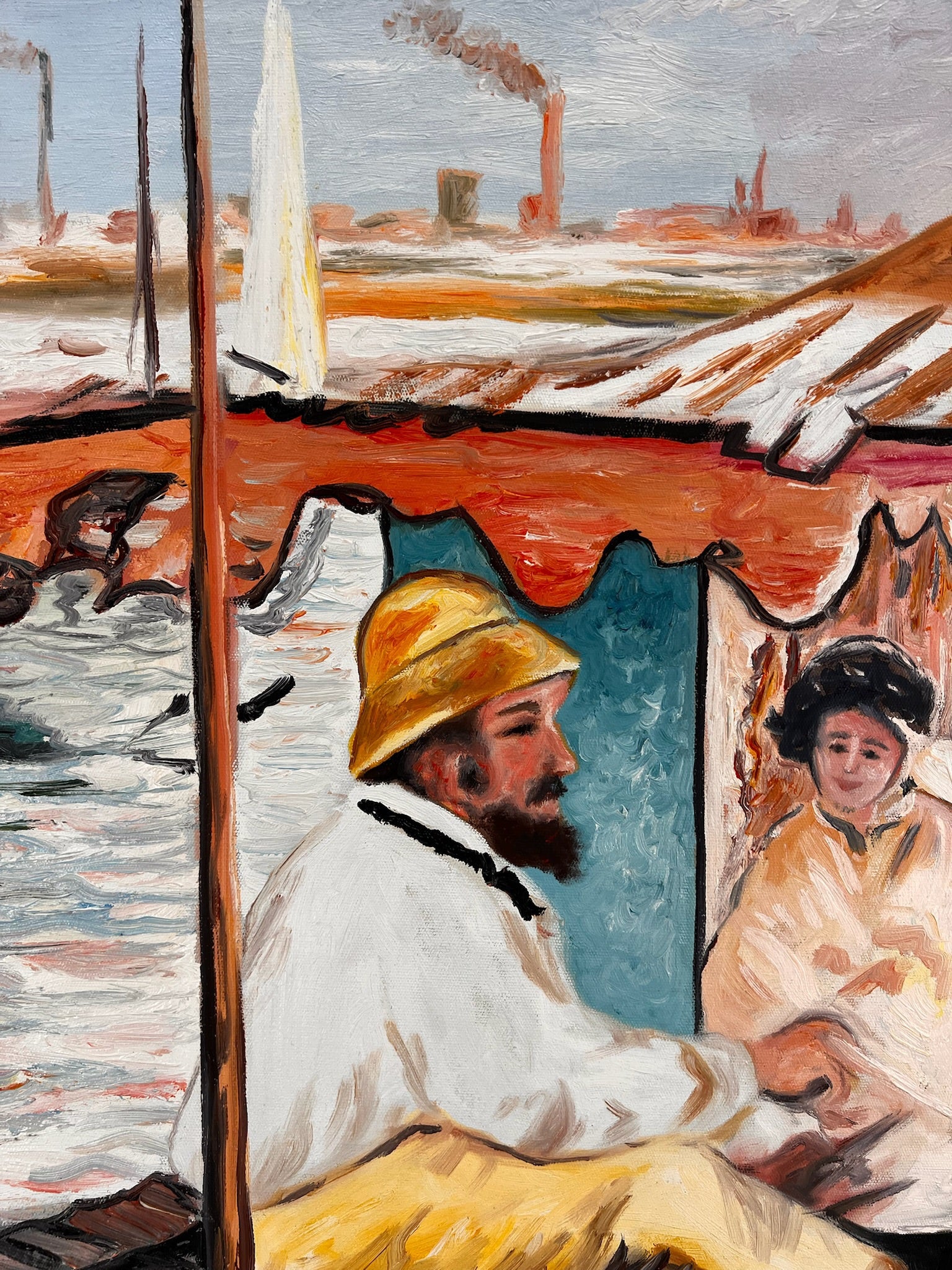 Dit schilderij is een handgeschilderde replica van Le Déjeuner sur l’Herbe, waarin Claude Monet zijn impressionistische stijl tot uitdrukking bracht. Het tafereel toont een schilder en zijn model in een boot, badend in een spel van licht en reflecties. De losse penseelstreken, frisse kleuren en levendige compositie maken het werk een voorbeeld van de impressionistische benadering: de natuur en het moment vangen in al zijn spontaniteit.