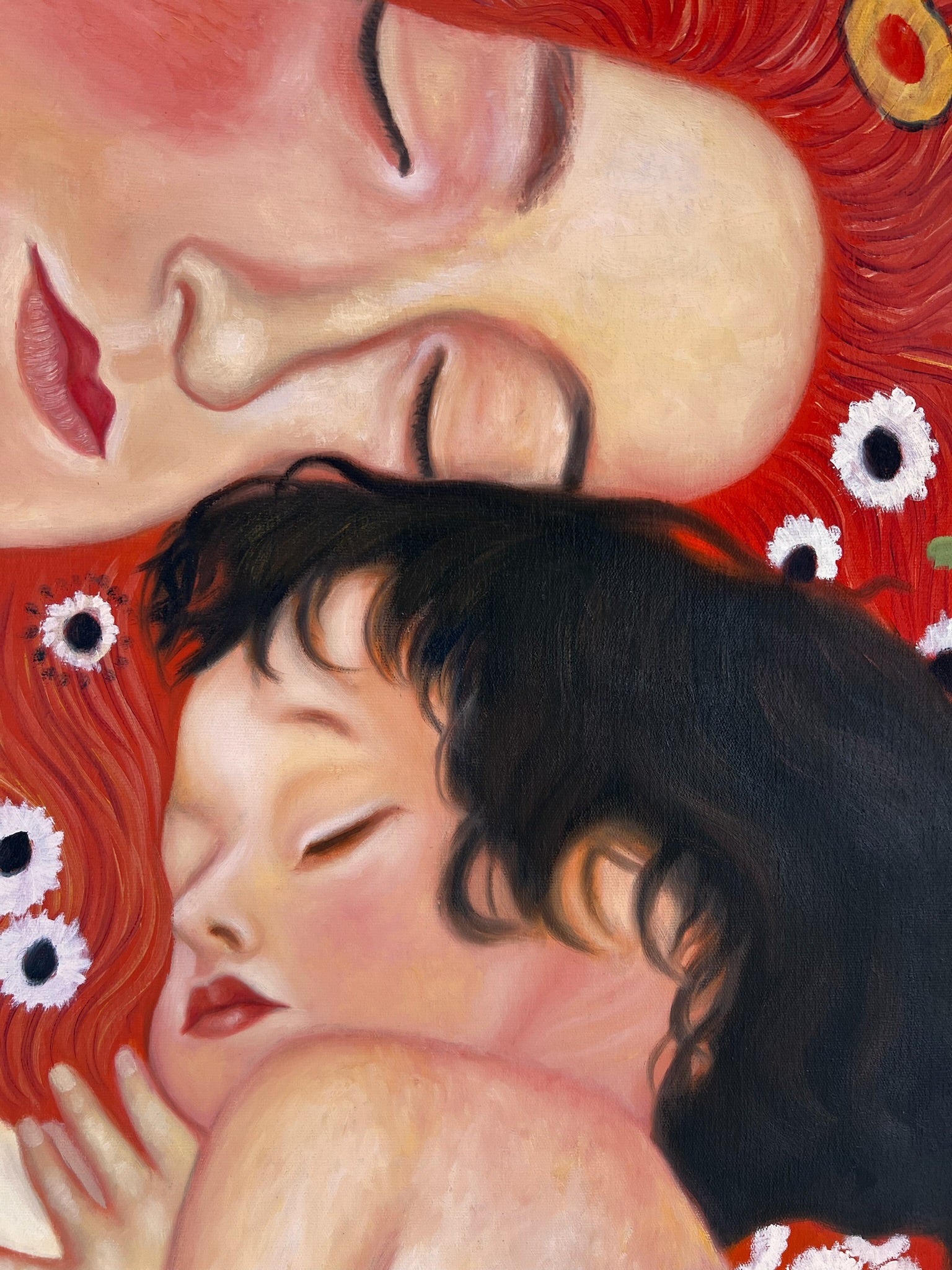 Dit prachtige handgeschilderde werk toont Mutter und Kind, een intiem en teder tafereel van Gustav Klimt. Het beeld maakt deel uit van zijn schilderij Die drei Lebensalter der Frau (1905), waarin Klimt de cyclus van het leven uitbeeldde. Het fragment met moeder en kind is uitgegroeid tot een zelfstandig icoon, dat wereldwijd geliefd is vanwege de warmte, liefde en geborgenheid die het uitstraalt.