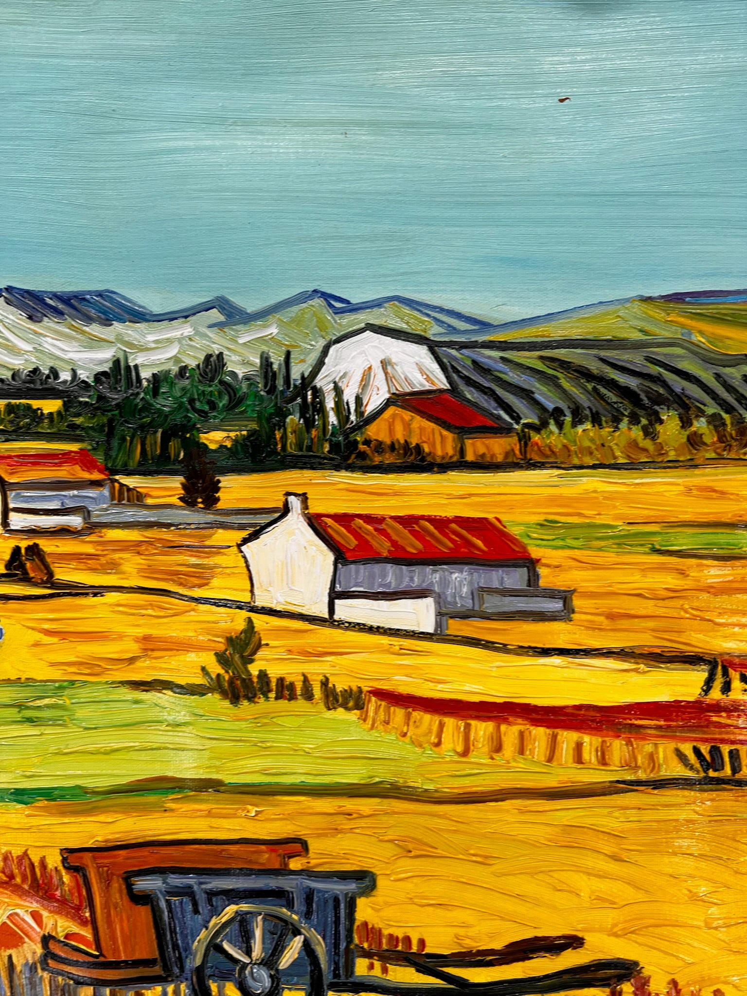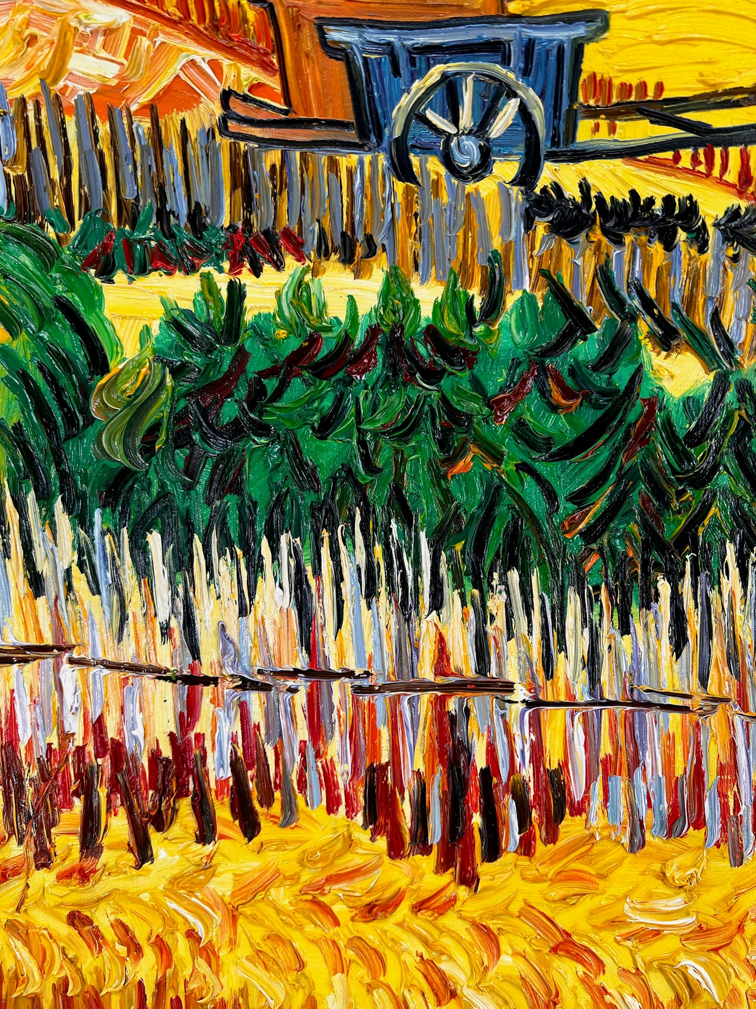Met zijn stralende gele velden, geometrische indeling en karakteristieke impastotechniek vangt dit werk zowel de rust als de kracht van het Zuid-Franse platteland. Deze replica behoudt de intensiteit en het ritme van het origineel en vormt een schitterend eerbetoon aan Van Gogh’s visie en vakmanschap.