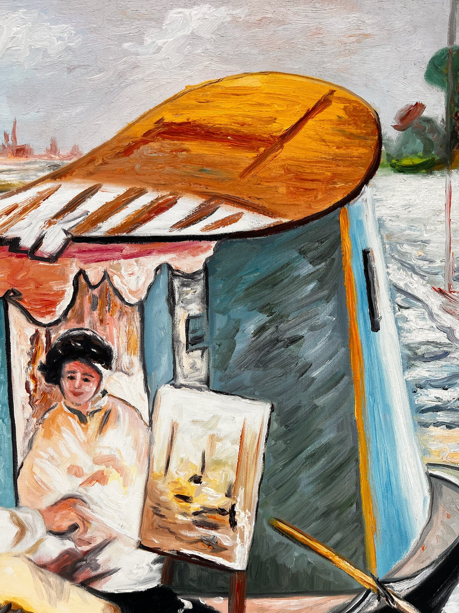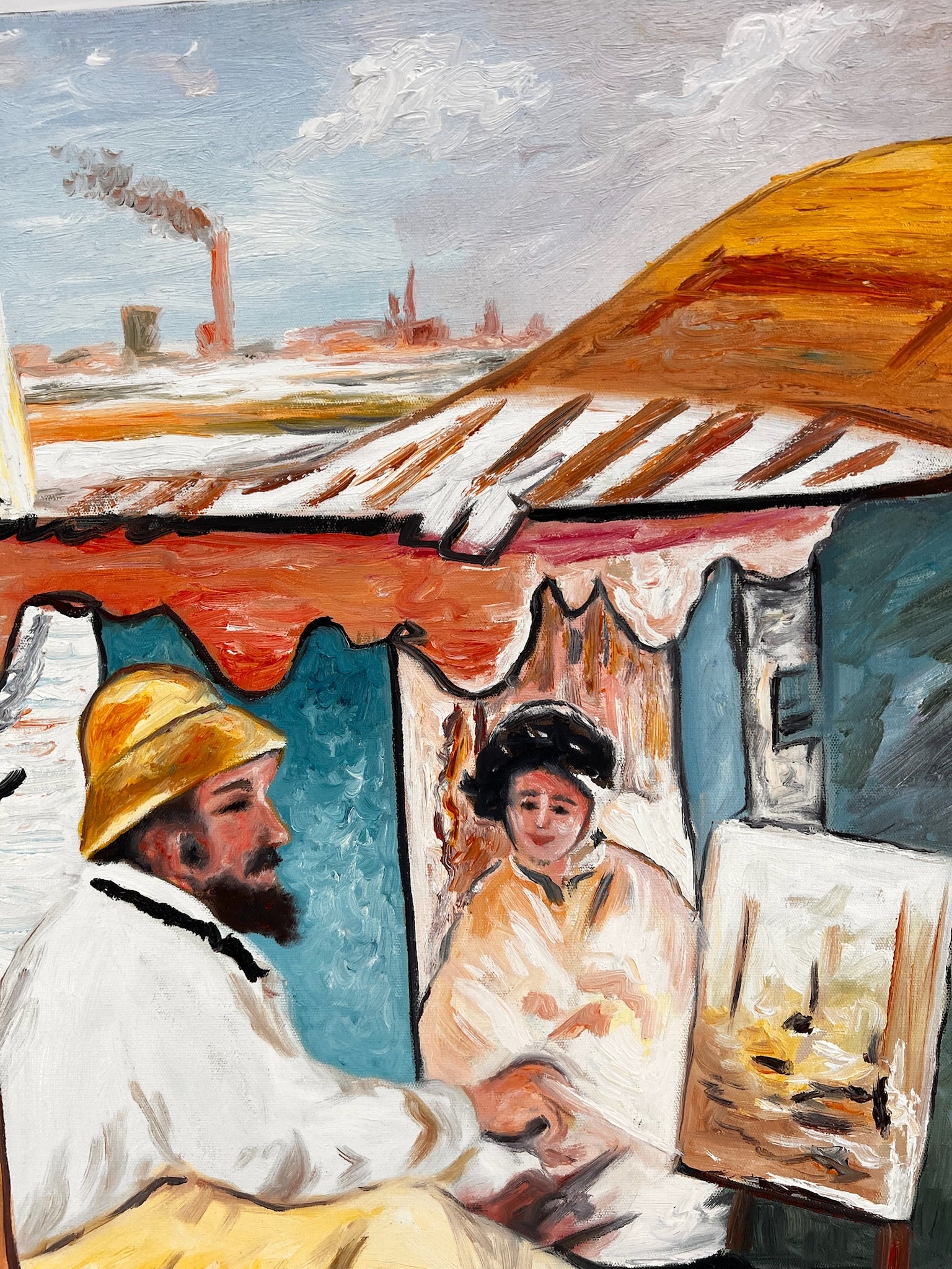 Dit schilderij is een handgeschilderde replica van Le Déjeuner sur l’Herbe, waarin Claude Monet zijn impressionistische stijl tot uitdrukking bracht. Het tafereel toont een schilder en zijn model in een boot, badend in een spel van licht en reflecties. De losse penseelstreken, frisse kleuren en levendige compositie maken het werk een voorbeeld van de impressionistische benadering: de natuur en het moment vangen in al zijn spontaniteit.