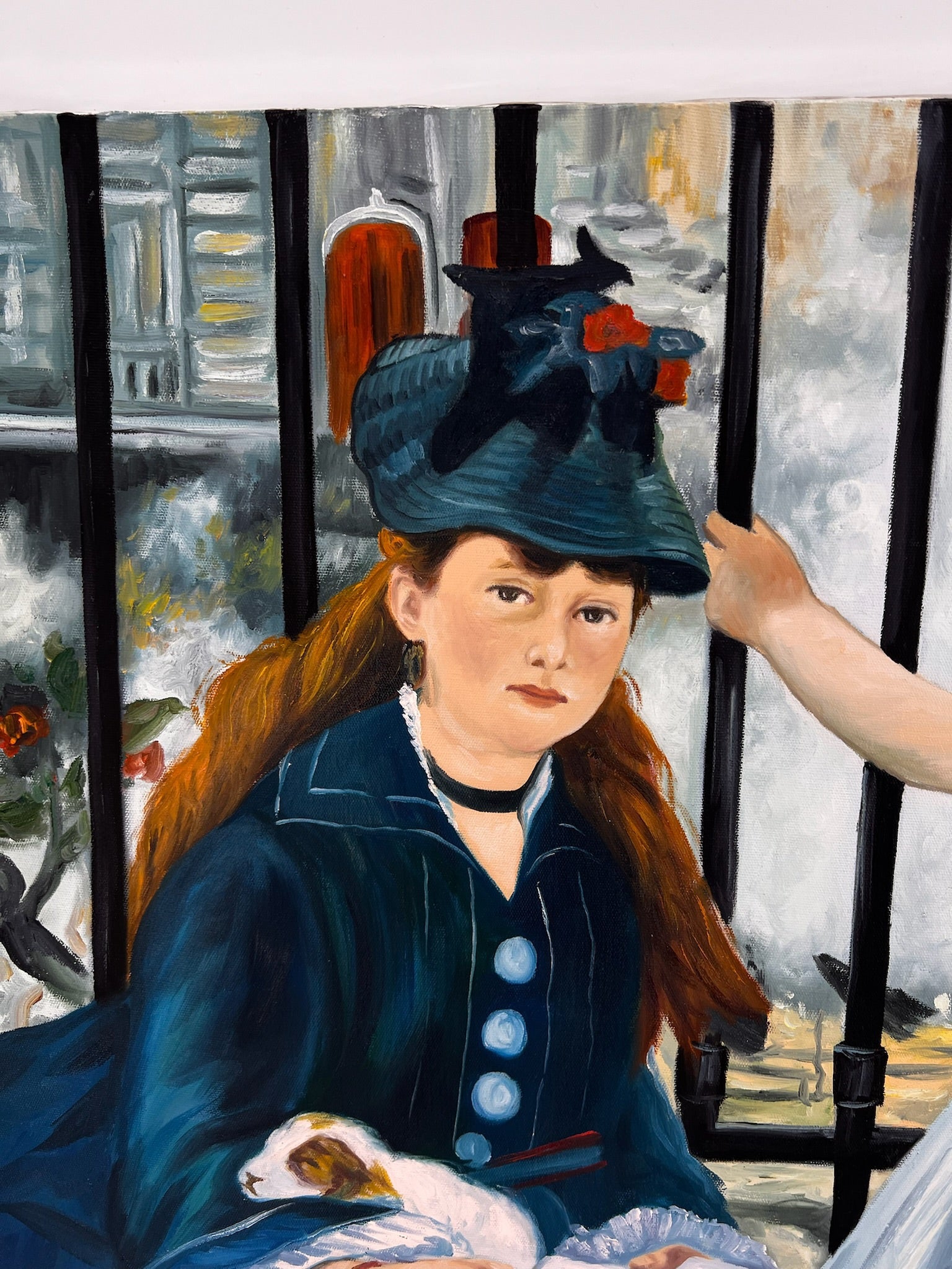 Dit handgeschilderde werk is een replica van The Railway (ook bekend als La Gare Saint-Lazare), geschilderd door Édouard Manet in 1873. Het schilderij toont een intieme scène van een jonge vrouw die met een boek en een klein hondje zit, terwijl een meisje in een blauwe jurk nieuwsgierig uitkijkt naar de rookwolken van de treinen achter het hek.