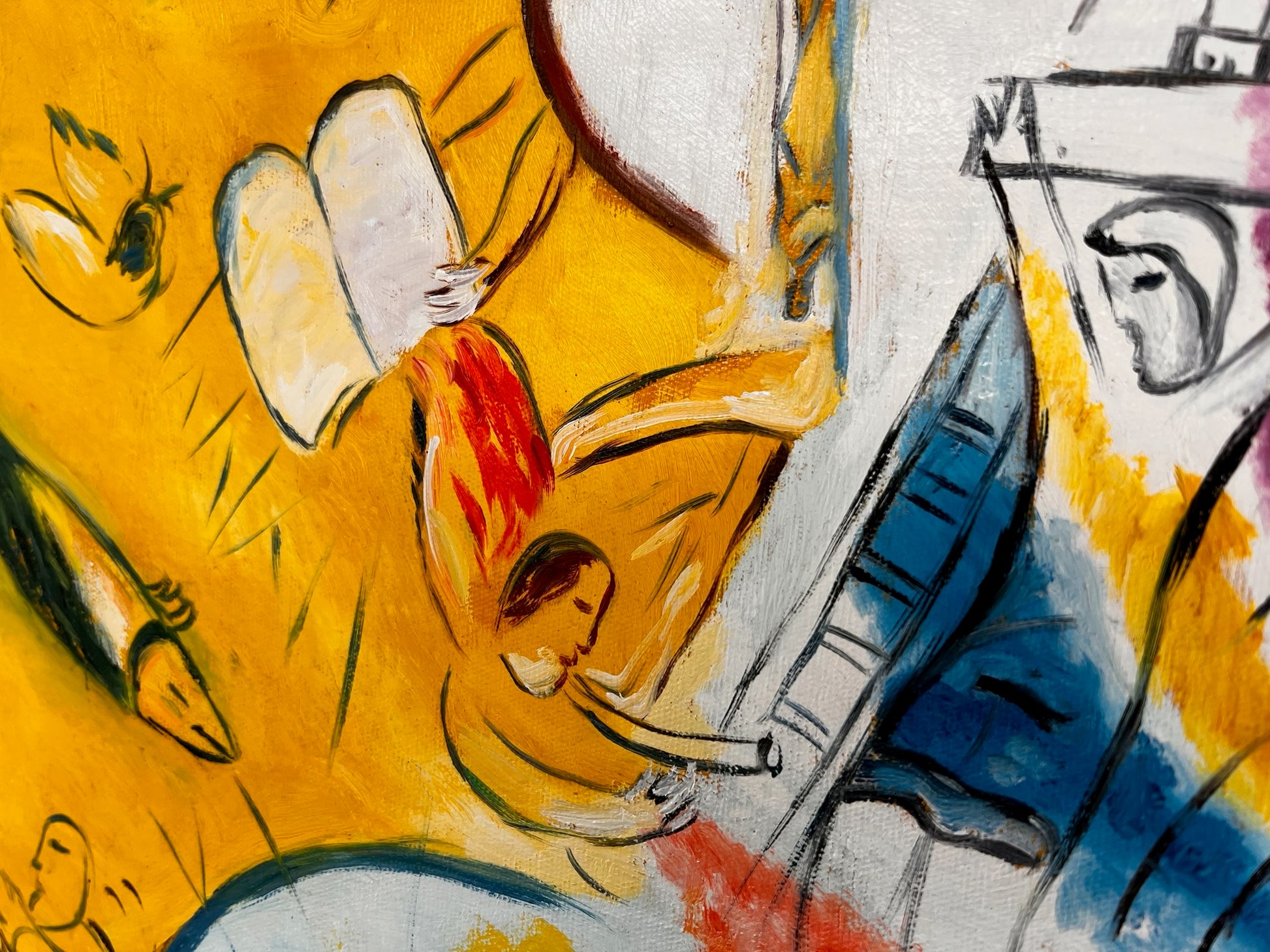 De handgeschilderde replica vangt de essentie van Chagall’s werk, met levendige kleuren en subtiele details die een verhaal van verbeelding en emotie vertellen. Dit kunstwerk is een prachtige toevoeging voor kunstliefhebbers die houden van modernisme en spirituele symboliek.