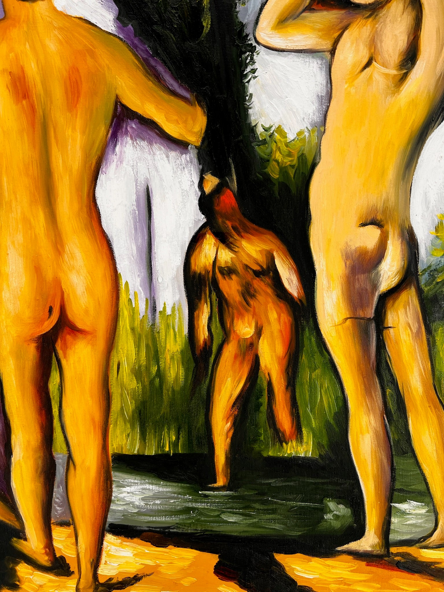De krachtige penseelstreken, warme huidtinten en het contrast met de donkere natuur op de achtergrond creëren een gevoel van monumentaliteit en tijdloosheid. Cézanne’s baders worden vaak gezien als een overgang tussen impressionisme en modernisme en beïnvloedden latere grootheden zoals Picasso en Matisse.