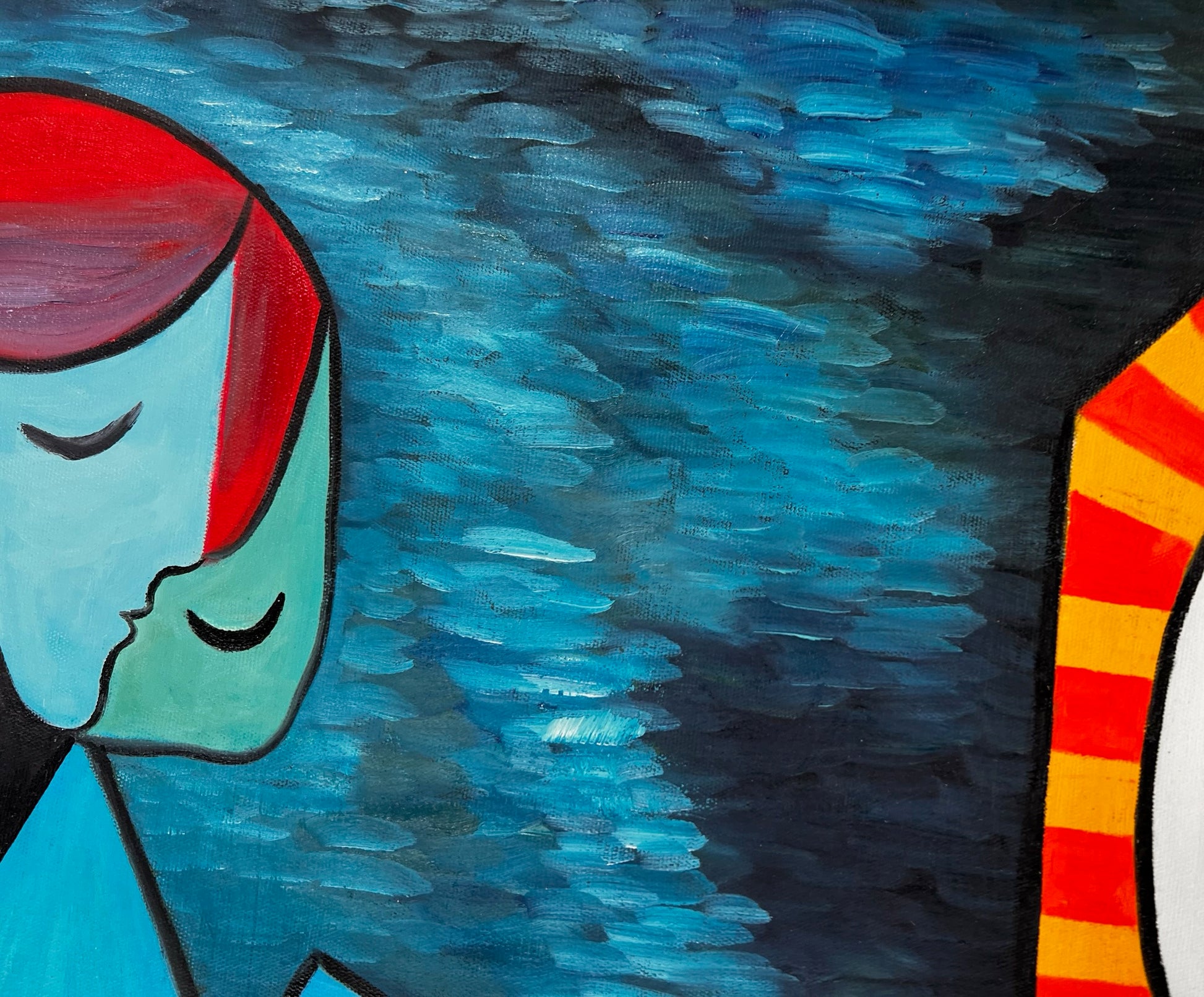 De kubistische stijl maakt dit werk tot een echte blikvanger die zowel modern als tijdloos oogt. Een perfect kunstwerk voor wie houdt van sterke kleuren en expressieve composities.
